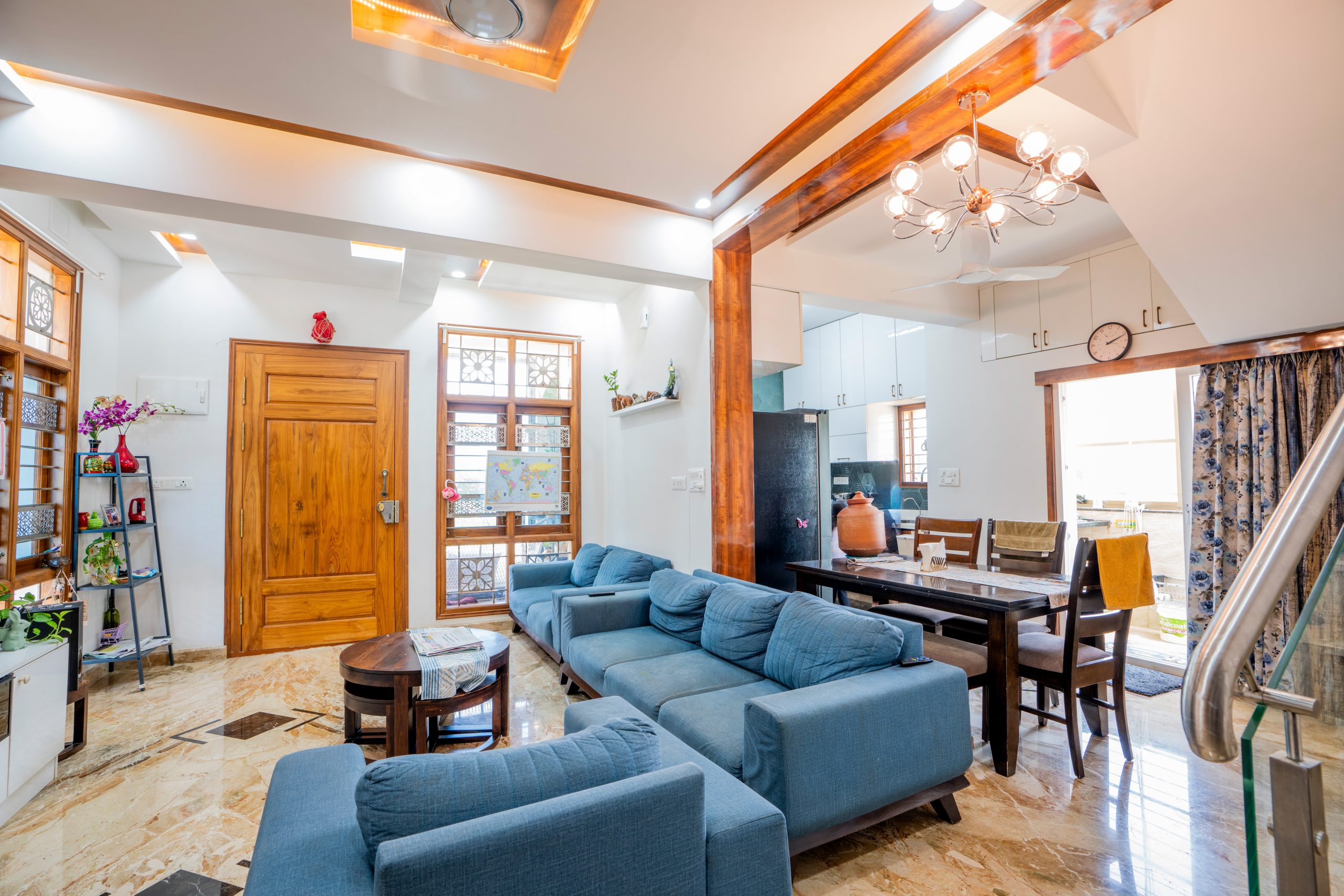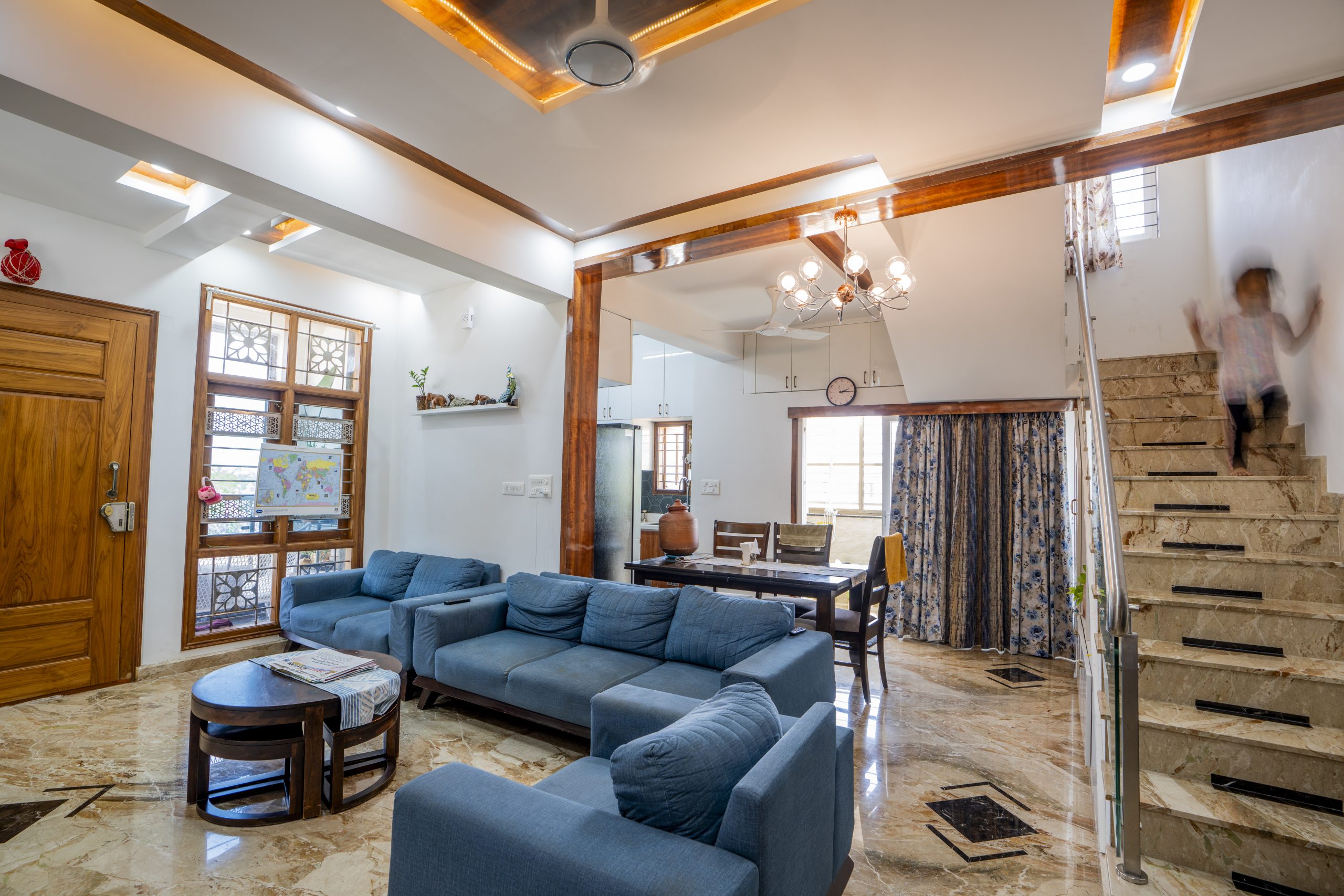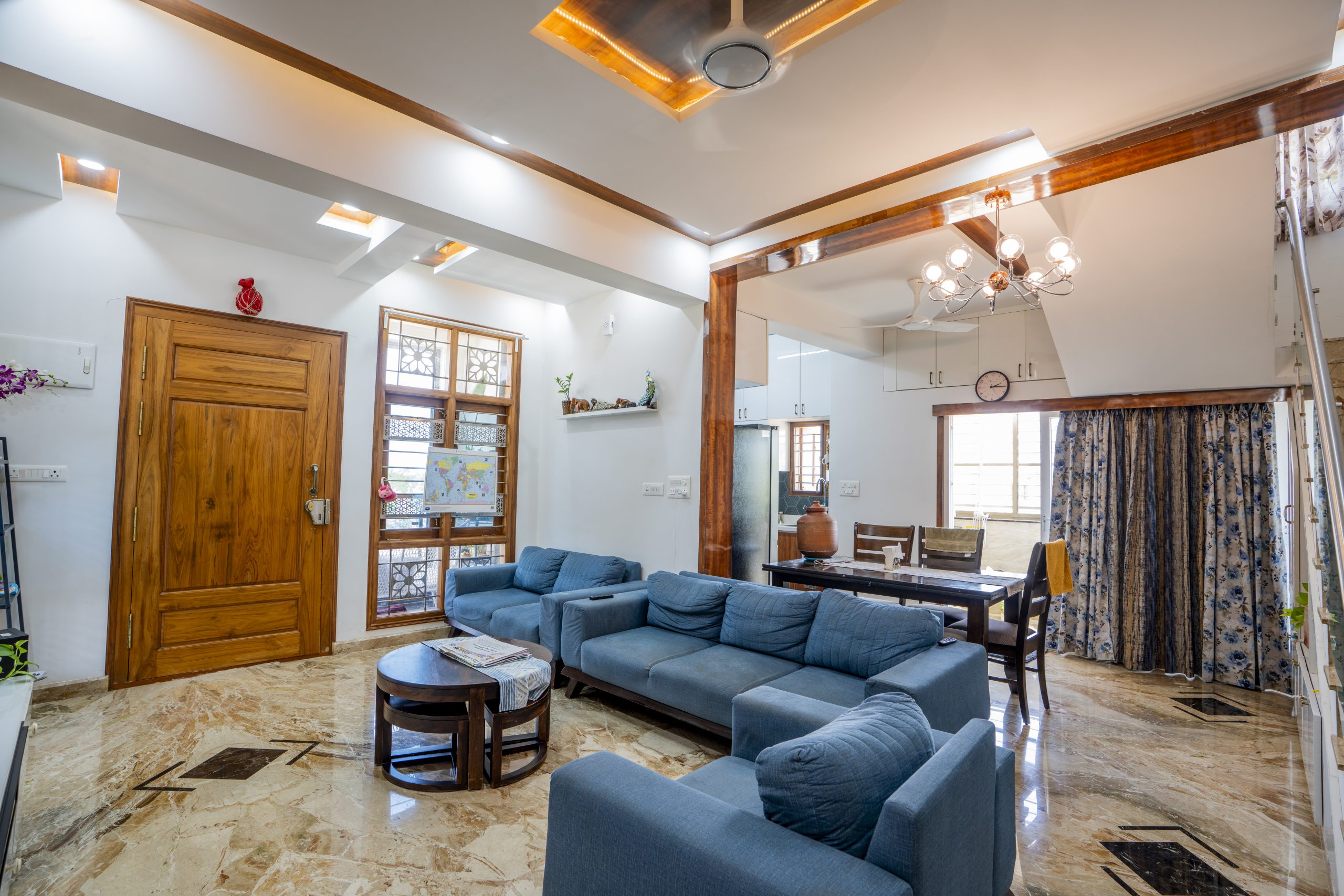 - Open-Concept Living: The ground floor of Lohith’s Residence boasts a spacious open-concept layout, allowing for fluid movement between the living, dining, and kitchen areas. Large windows and sliding glass doors flood the space with natural light, creating a bright and inviting ambiance.